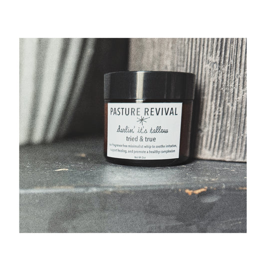 Pasture Revival grew out of a new mama’s need to heal and keep her baby safe. We make all-natural, organic tallow skincare that’s non-toxic and designed to nourish, restore, and protect naturally.